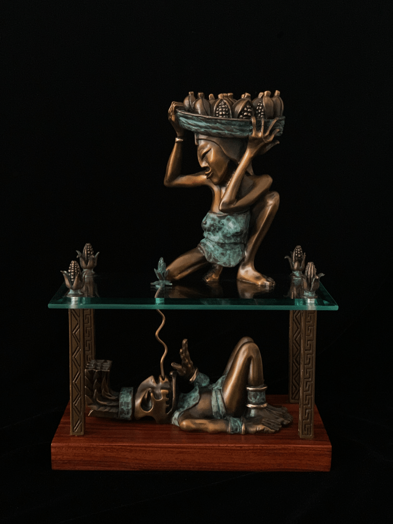 This bronze sculpture, made using the lost wax method, depicts the Maya burial ritual of placing corn kernels, sacred to the Maya, in the mouth of the deceased to help him on his new journey into the afterlife and was also a symbol of rebirth. 1of 2 productions